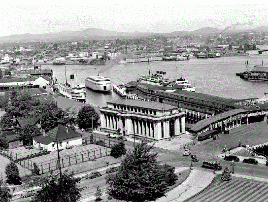 The MV Kalakala sailed, mostly in Puget Sound around Seattle, from 1935 until 1967, when she was moved from harbour to salvage yard before finally being scrapped a few years ago. While she sailed, she was a glorious art deco anomaly, with high-decked streamlined curves. In 1947, she sailed into Victoria Harbour, and was photographed from the roof of the Legislature, coming into dock at the Steamship Terminal building. And when we started a project a year ago to refurbish some of the interior spaces at the Steamship Terminal, we chose this photograph as the centrepiece.