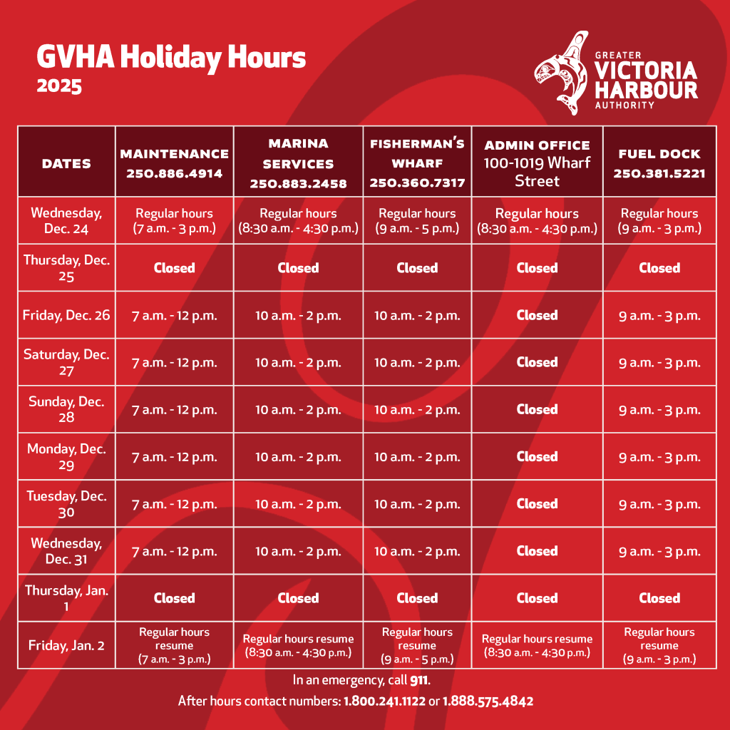 All GVHA departments will be closed on Christmas Day and New Year’s Day. GVHA’s administration office on Wharf Street will close from December 25 until January 1. The maintenance shop, marina services, Fisherman’s Wharf office, and the fuel dock will operate limited hours between December 26 and December 31.